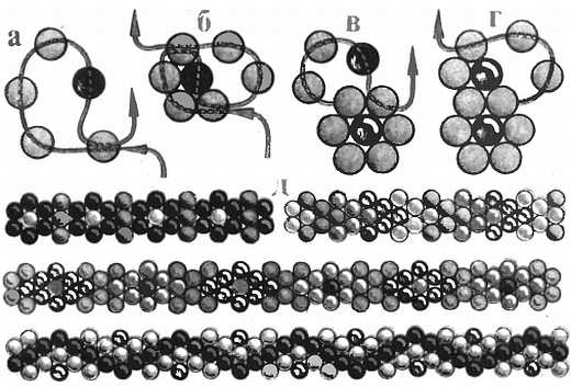 а-г последовательность выполнения; д вид цепочки в зависимости от применения бисера разных цветов