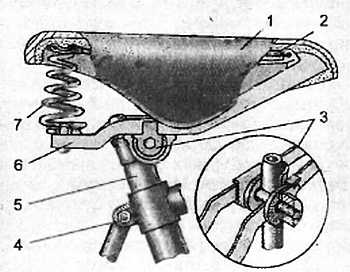 1 покрышка седла; 2 и 7 пружины; 3 замок; 4 болт с гайкой; 5 седлодержатель; 6 каркас