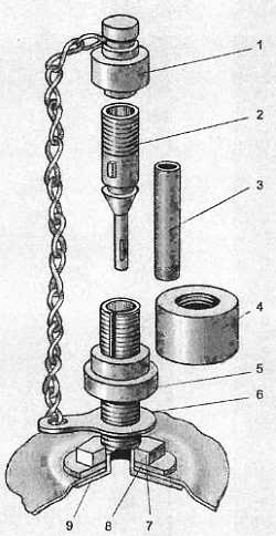 1 пылезащитный колпачок; 2 золотник; 3 резиновая трубка; 4 и 7 гайки; 5 контргайка; 6 корпус с фланцем; 8 шайба; 9 фланец
