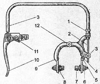 1 штуцер; 2 трос; 3 болт с гайкой; 4 левая тормозная скоба; 5 пружина; 6 гайка; 7 тормозная колодка; 8 держатель колодки; 9 правая тормозная скоба; 10 рукоятка; 11 гайка; 12 болт с гайкой