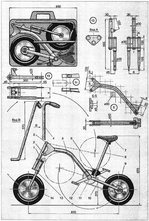 1 хомуты крепления полудуги руля; 2 фиксирующий узел; 3 узел поворота передней вилки при складывании; 4 руль; 5 рама; 6 барашковые гайки с болтами центрального фиксирующего узла; 7 седло; 8 подседельная труба; 9 заднее колесо; 10 задняя вилка; 11 поворотный узел задней вилки; 12 педальный узел (от любого велосипед); 13 передняя вилка; 14 переднее колесо Размеры «а» и «б» выбираются в соответствии с размерами применяемых колес; размер «в» определяется по используемой в конструкции каретке