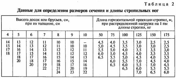 Пользоваться таблицей можно так. На основании имеющихся в наличии пиломатериалов определяют размеры сечения стропил (высоту и толщину). Затем, следуя по строке с найденным сечением стропил, во второй части таблицы находят максимально возможную длину их в соответствии с распределенной нагрузкой на одну стропильную ногу. Под длиной стропил понимается свободная длина стропильных ног. В случае если под стропилами имеются подкосы, за длину принимается расстояние между любыми двумя опорами.