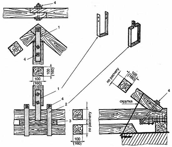 1 металлическая полоса; 2 металлическая скоба; 3 деревянная подкладка; 4 болт