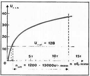 Весьма существенное значение имеет то, что генераторы постоянного тока могут работать в большом диапазоне скоростей оборотов. В этом случае просто изменяется мощность. То есть, если в паспорте какого-либо генератора постоянного тока указано номинальное (рабочее) число оборотов, например, 5000 об/мин, то это не означает, что при других скоростях он не будет работать. Практически он начнет вырабатывать электрический ток сразу, как только его ротор получит вращение. Примерная характеристика зависимости напряжения от числа оборотов генератора показана на рис. 1.