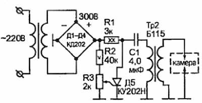 Трансформатор Тр1 мощностью 50-100 Вт. На его первичную обмотку поступает переменное напряжение 220В, а с выходной обмотки напряжение около 300В поступает на двухполупериодный выпрямитель (Д1-Д4). С выпрямителя пульсирующее напряжение через балластное сопротивление R1 мощностью 20 Вт и номиналом 3к поступает на неполярный (неэлектролитический!) конденсатор С1 емкостью 4 мкФ. С повышением напряжения на обкладках конденсатора одновременно увеличивается напряжение на управляющем электроде диода Д5 (тиристор КУ 202Н). Тиристор работает без радиатора. При достижении напряжения около 250В тиристор открывается. Происходит быстрый разряд конденсатора через первичную обмотку автомобильной катушки зажигания (Тр2). Корпус катушки зажигания (например, Б-115, или любая другая на 12В) соединяют с «землей», а высокое напряжение подается на разрядник ионизационной камеры. Потенциометром R3 номиналом 2к добиваются ровного горения высоковольтной искры. Резистор R2 мощностью 5Вт и номиналом 40к ограничительный. Электроды разрядника можно изготовить из проволоки диаметром 1 мм. Длина искрового промежутка около 10 мм.