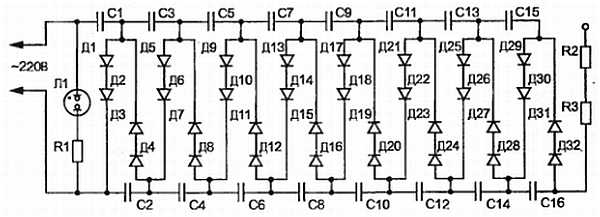 Д1-Д32 диоды типа Д226Г; R1 резистор МЛТ-0,51 МОМ; С1-С16 конденсаторы типа КСО 0,01 мкФ, Л1 неоновая лампа ИН-3; R2, R3 резисторы типа КЭВ-0,51,1 ГОм