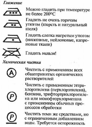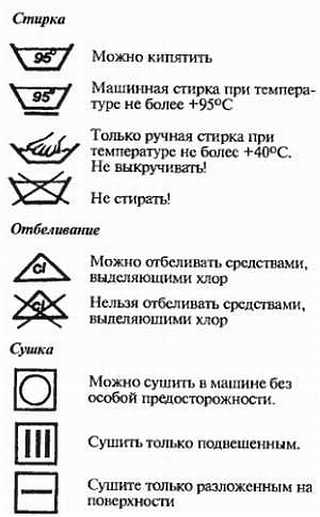 типов обозначений, касающихся стирки, отбеливания, глажения, химической чистки, сушки. Даем по ним необходимые расшифровки: