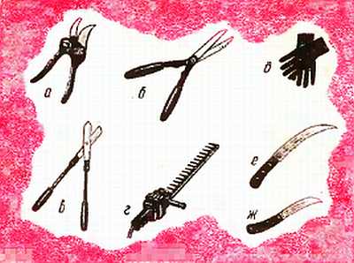 Обрезку листопадных деревьев и кустарников следует производить сразу по окончании цветения не откладывая: цветковые вечнозеленые в мае, а хвойные осенью. Вот какие инструменты необходимы для обрезки: прежде всего секатор (рис. 9,а), при должном уходе он будет остро резать многие годы, садовые ножницы необходимы для стрижки изгородей (рис. 9,б), садовые ножницы с длинными ручками (рис. 9,в) нужны для обрезания веток толщиной 13,5 см, особенно в неудобных для отпиливания местах, значительно облегчит работу по содержанию в порядке длинных изгородей электрическая машинка для стрижки (рис. 9,г). Перчатки (рис. 9,д), которые защитят ваши руки от колючек и шипов, должны быть изготовлены из прочного и эластичного материала. Еще пригодится садовая пила (рис. 9,е) для веток толще 1,5 см, садовый нож для зачистки неровных срезов и обрезки тонких веток (рис. 9,ж).