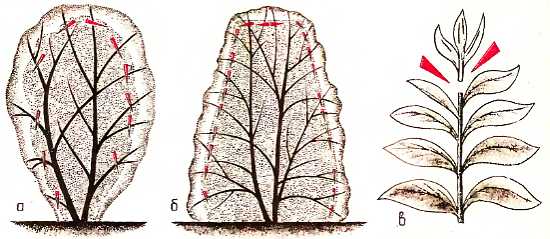При стрижке удаляются концы веток (рис. 7,а). Это стимулирует рост почек, расположенных ниже среза. А для поддержания формы изгородей и фигурно подстриженных кустов удаляют точки роста с небольшим отрезком ветки по всему контуру (рис. 7,б).