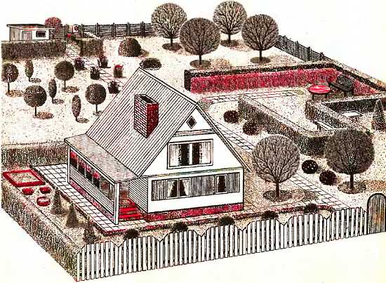 И все же деревья и кустарники не только просты в уходе, они еще и помогают удачно спланировать и превосходно разбить декоративный сад на сравнительно небольшом участке земли (рис. 10).