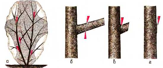 Потом отпилите сучок почти вровень со стволом и зачистите неровные края садовым ножом (рис. 8,в). Замажьте срез садовым варом. При регулярном прореживании получается более высокий и раскидистый