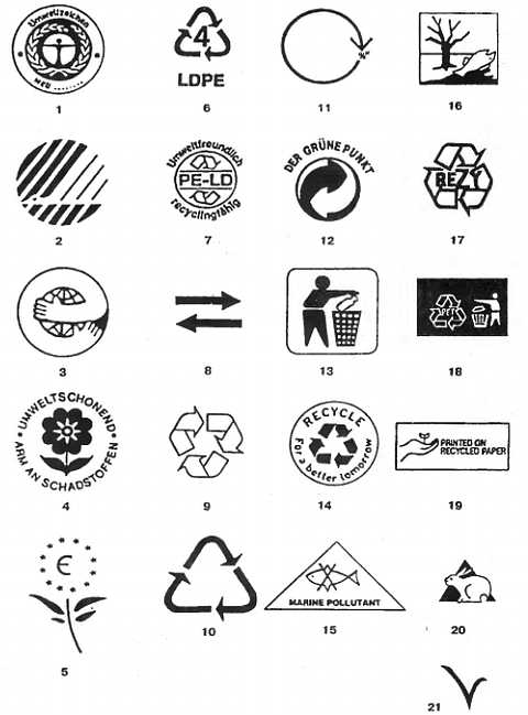 Страны Европейского Сообщества ввели единый экознак (5). Он может находиться на некоторых видах товаров, исключая провиант, напитки и лекарства. Его выполняют в четырех цветах: зеленом, голубом, черном по белому или на «выворотке», т. е. белым по черному. Графика символов, которыми помечаются предметы, поддающиеся вторичному использованию (ресайклингу) или полученные в результате вторичной переработки, часто указывает на замкнутый цикл «изготовление использование утилизация воссоздание» с информацией о материалах, поддающихся переработке (6 и 7).