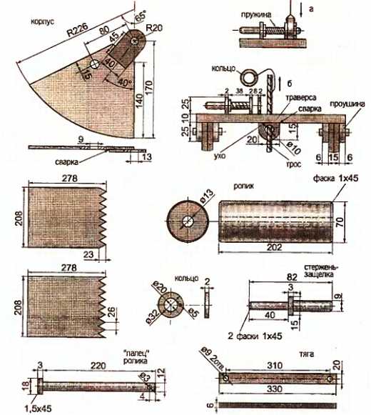 Основные детали устройства: 1 корпус (вернее две «челюсти»); 2 ролик; 3 «палец» ролика; 4 трос; 57 болт М-8 (6 шт.); 6 тяга (4 шт.); 8 проушина; 9