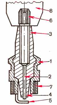 1 корпус; 2 центральный электрод; 3 изолятор; 4 конус изолятора (юбка); 5 боковой электрод; 6 втулка; 7 резиновая трубка; 8 патрон дрели