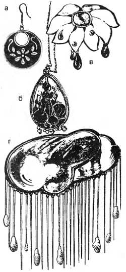 а серьга; б, в кулон из гарнитура «Храм» и брошь «Ромашка» (Р. и Е. Куликовы); г брошь «Дождик» (Л. Борисова)