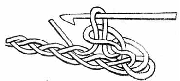 Полустолбик с накидом. Вывязав последнюю петлю цепочки, накидывают рабочую нитку и оставляют ее на крючке (накид). Затем вводят крючок в 3-ю петлю цепочки, накидывают нитку и протаскивают ее через петлю цепочки. Снова накидывают рабочую нитку и протаскивают ее через 2 петли и накид, находящиеся на крючке (рис. 5). Для получения 2-го столбика снова делают накид на крючок, вводят его в следующую петлю цепочки, протаскивают через нее петлю из рабочей нитки и провязывают петли и накид так же, как в 1-м столбике.