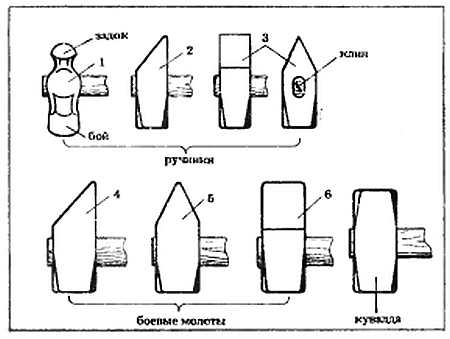 К ударному инструменту относят молотки-ручники, боевые молоты и кувалды (рис. 9). Ручник основной инструмент кузнеца, с помощью которого он кует небольшие изделия или управляет процессом ковки с молотобойцами.