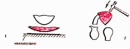 Изделия с неглубокой вытяжкой делают при помощи разнообразных молотков и оправок без применения пайки, а сложные, такие, как кувшины, кумганы, кубки, по частям, спаивая затем их в единое целое.