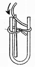 Принцип вязания на шпильке и «вилке» один. Конец нитки от клубка завязывают таким образом, чтобы образовалась петля из нитки. Длина петли должна составлять половину расстояния между концами шпильки. Шпильку держат левой рукой концами вверх. Петлю из нитки надевают на левый конец шпильки, а нитку от клубка заводят спереди назад за правый конец и укладывают на левый указательный палец, как при вязании крючком (рис. 36).