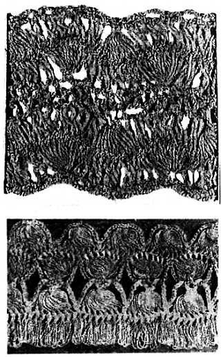 Тесьму, снятую с «вилки», обвязывают так, чтобы мотивы веера из 5 пар петель чередовались с пучками из 10 петель, а между ними было по 3 воздушные петли. Обвязывают петли 2-й стороны тесьмы. Прежде чем соединить первую полосу со второй, ее обвязывают цепочками из 5 петель и столбиками без накида, вводя крючок под каждую цепочку из 3 петель. Выполняя такие же цепочки по краю 2-й тесьмы, их соединяют с цепочками 1-й тесьмы. Соединяя 2 полосы тесьмы, следят за тем, чтобы мотивы веера одной тесьмы располагались против пучков другой тесьмы. Так соединяют все полосы. Шарф обвязывают цепочками из 5 петель, а к узким краям прикрепляют бахрому из ниток.