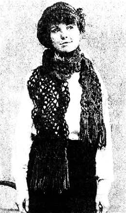 Для шарфа связаны 2 полосы тесьмы на вилке по принципу вязания первого образца. Длина каждой тесьмы равна длине шарфа. Один край каждой тесьмы обвязывают цепочками из 5 петель и столбиками без накида. Соединив 2 тесьмы, готовят цепочку из 3 петель, вынимают крючок из петли и вводят его под цепочку 1-й тесьмы сверху вниз, поддевают только что снятую петлю, протаскивают ее к себе и вяжут 3 воздушные петли. Снова вынимают крючок из петли и вводят его сверху вниз под цепочку 2-й тесьмы. После смыкания со 2-й тесьмой вяжут 3 воздушные петли и делают смыкание со 2-й цепочкой 1-й тесьмы. Так соединяют всю тесьму. К узким краям привязывают кисти длиной 18 см.