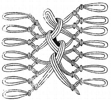 петельки тесьмы. Конец снятой тесьмы складывают вместе и скрепляют булавкой или связывают ниткой и продолжают вязание.