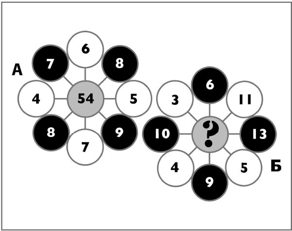 Это новая возможность попытать счастья с «числовыми колесами», с которыми вы впервые столкнулись в задаче 18. Как и прежде, ваша задача вычислить недостающее число на фигуре Б.