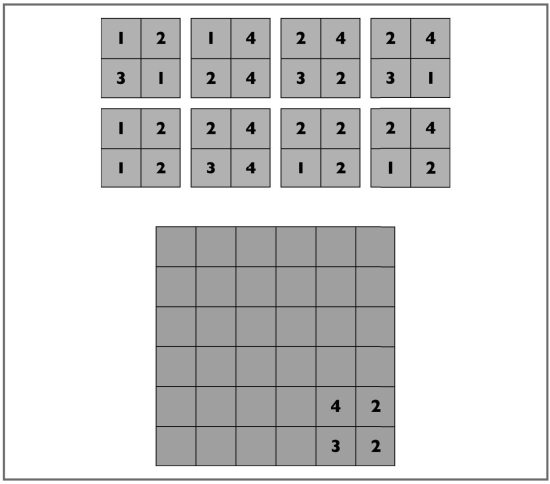 Разместите 8 плиток в решетке в один ряд с данной так, чтобы все соседствующие числа совпадали там, где плитки выстраиваются в ряд. Плитки можно вращать на 360˚, но ни одну нельзя «вывернуть наизнанку».