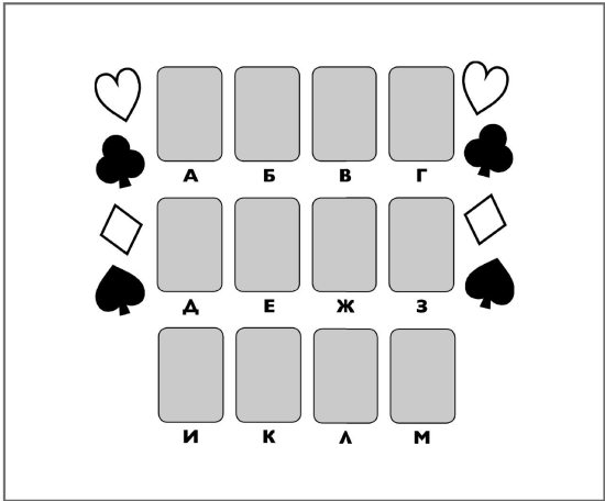 Ни одна карта по горизонтали или вертикали не соседствует с картой того же цвета (червы и бубны красные; пики и трефы черные), и в каждом горизонтальном ряду присутствуют 4 масти, а в каждой вертикальной колонке 3 разные масти.