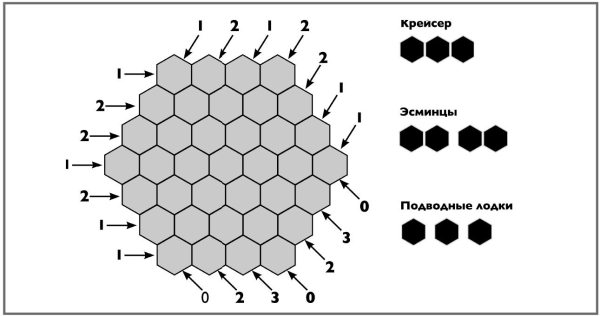 Ваша задача разместить 6 поименованных в списке кораблей на схеме. Число и стрелка, указывающая на ряд шестиугольников, относятся к числу шестиугольных клеток в этом ряду, занятых «палубой» одного или более кораблей. Корабль может располагаться в любом направлении, но друг с другом корабли не соприкасаются. Начните с того, чтобы поставить маленький крестик в тех шестиугольниках, которые наверняка не будут заняты; затем заштрихуйте те, которые наверняка будут заняты частью корабля.