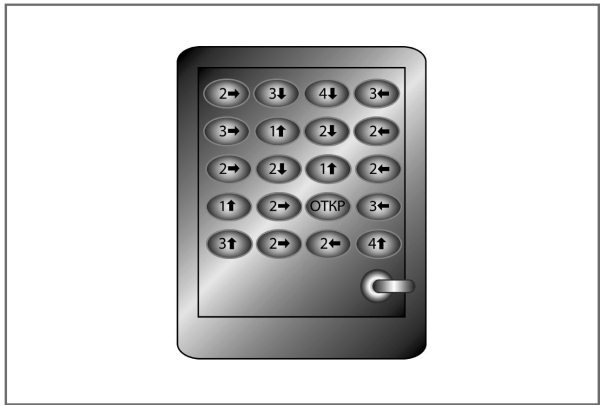 Как у вас обстоят дела со взломом сейфов? Все 20 кнопок нужно нажать в правильном порядке, закончив кнопкой «откр.». Порядок нажатия указан числами и стрелочками на кнопках. Воспользуйтесь логикой и оперативной памятью, чтобы проложить обратный маршрут от последней кнопки и определить, какая кнопка будет первой в последовательности.