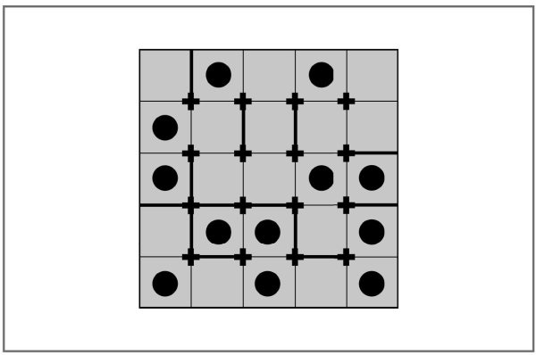 Разделите стенами ресторан на отдельные кабинеты (некоторые стены уже нарисованы). В каждом кабинете должно быть 2 кружка (столика), размеры кабинетов должны соответствовать заданным ниже, а каждый крестик должен соединяться по меньшей мере с 2 стенами.