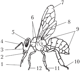 Внешнее строение пчелы: 1 хоботок; 2 верхняя челюсть; 3 голова; 4 усик; 5 сложный глаз; 6 грудь; 7 переднее крыло; 8 заднее крыло; 9 брюшко; 10 задняя нога; 11 средняя нога; 12 передняя нога