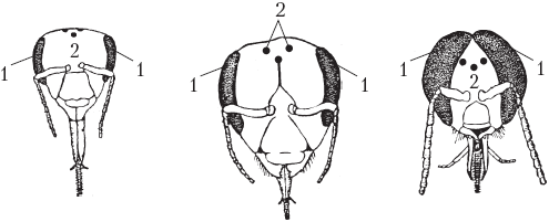 Расположение глаз у матки, рабочей пчелы и трутня: 1 сетчатые глаза; 2 простые глаза