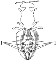 Внутреннее строение пчелы: 1 верхнечелюстная железа; 2 глоточная железа; 3 надглоточный узел (мозг); 4 задняя ветвь глоточной железы; 5 грудная железа; 6 пищевод; 7 аорта; 8 спинная диафрагма; 9 мальпигиевы сосуды; 10 камеры сердца; 11 толстая кишка; 12 ректальные железы; 13 прямая кишка; 14 жало; 15 средняя кишка; 16 брюшная диафрагма; 17 медовый зобик; 18 нервная цепочка