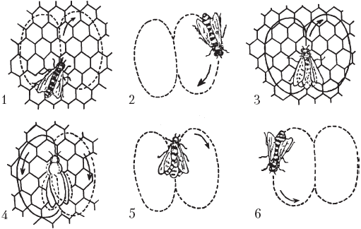 «Виляющий танец» сборщицы пыльцы: 1, 2, 3, 4, 5, 6 последовательные стадии танца
