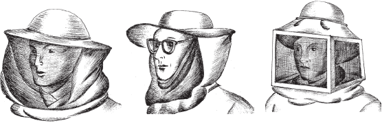 Сетка для защиты лица от ужаленья пчел. Лицевая сетка имеет вид шляпы, сшитой из ситца, с передней стороной из черного тюля. Нижняя часть сетки плотно стягивается вокруг шеи резинкой или шнурком.