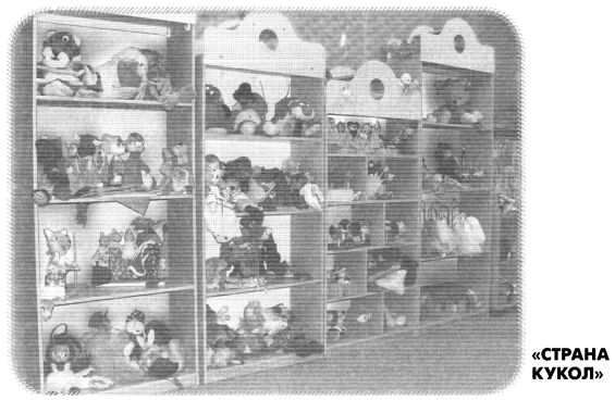 В этом же помещении стоят шкафы, имеющие открытый доступ для детей. Шкафы это «дома», в которых живут куклы. Здесь есть также модули, на которых расположены большие ростовые куклы.