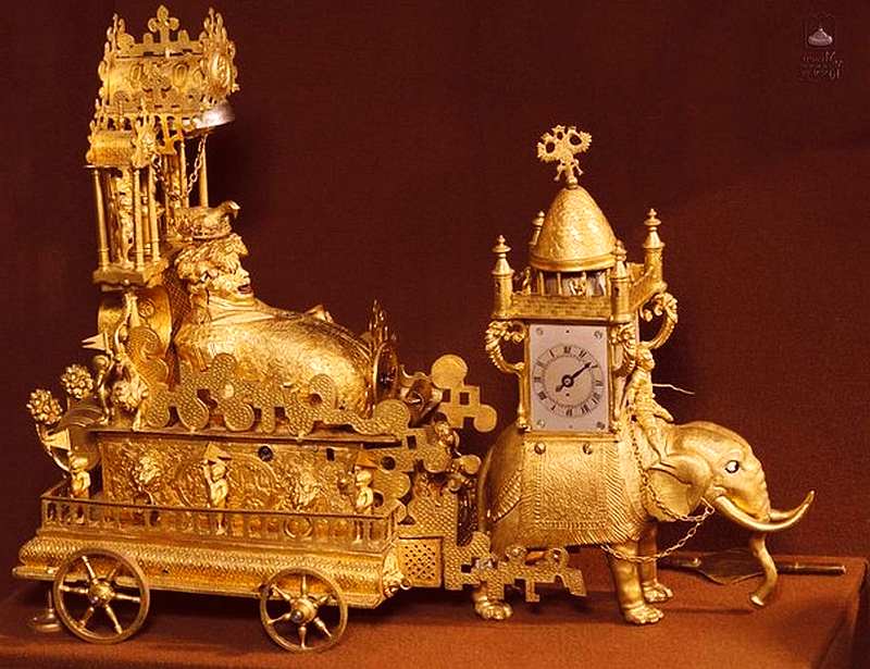 Механизм часов закреплен в корпусе колесницы, в конце ее, за спиной Бахуса, возвышается фигурный навес, в средней части которого закреплены колокол и фигурка звонаря. Маленький круглый циферблат с одной часовой стрелкой и арабскими цифрами помещен на груди бога, а вместо его ног еще один, тоже круглый и с одной стрелкой, но большой и с арабскими и римскими цифрами. Перед большим циферблатом, на бочке, на дне которой изображена веселая пирушка, сидит возница. Бронзовый позолоченный слон прикреплен к колеснице цепочками и фигурными пластинками. На его спине башня с часами под высоким куполом, увенчанным двуглавым орлом. Вокруг купола открытая терраса с четырьмя башенками по углам и пятью фигурками стражей с ружьями. Бока слона прикрыты чепраком, а на его шее сидит погонщик с хлыстом.