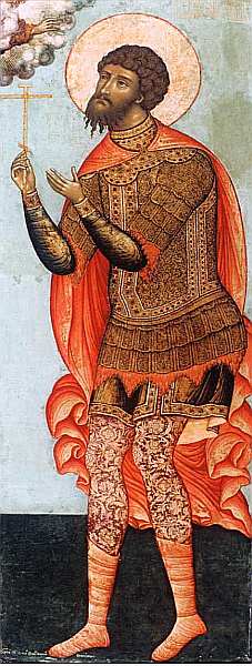 На иконе небесный покровитель царя представлен в молитвенной позе. Его лицо и руки написаны в светотеневой манере. Иконописец, основываясь на исповедуемом им принципе «живоподобия», словно пытается объяснить, как телесная красота может стать отражением красоты духовной. Отсюда изящный изгиб тела святого, как бы танцующая поза. Окутывающий фигуру святого огненно-красный плащ, алые сапожки, мельчайшая разделка его доспехов и одежды, напоминающая тончайшую золотую паутинку, призваны показать, как под влиянием молитвы его тело начинает светиться, источая божественный свет.