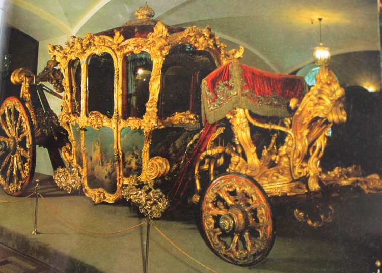 причудливо извивающиеся по крыше и стенкам, дышлу и колесам, образуют гигантскую фигурную раму на задке и широкую пластичную подножку на передке кареты. Отдельные элементы резной декорации напоминают то вспененные волны, то столь характерные для стиля рококо завитки раковины, то замысловато извивающиеся растительные побеги. Вызолоченные детали хорошо гармонируют с малиновой обивкой корпуса и соответствующей по колеру окраской колес, создавая тот мажорный, праздничный, торжественный настрой, что так характерен для придворной культуры Франции и России первой половины и середины XVIII века. Среди буйства изогнутых линий, текущих и струящихся форм на бронзовых накладных пластинах, прикрывающих рессоры, располагаются фигурки путти. Подобных резвящихся обнаженных мальчуганов можно видеть на живописных панно, представленных на передней и боковых стенках экипажа.