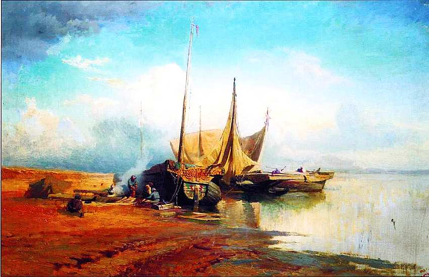 Введя в пейзаж бытовой мотив с барками и бурлаками, художник стремится прежде всего подчеркнуть гармонию человека и природы. Невольно возникает сравнение с картиной И. Е. Репина «Бурлаки на Волге». Известно, что многие живописцы совершали путешествие по этой реке и видели тяжкий труд бурлаков-невольников, подобные сюжеты встречаются и у других мастеров этого времени. Но Васильев, оставаясь верным пути художника-пейзажиста, не пытается призвать зрителя к социальному прочтению полотна, а стремится возвысить восприятие увиденной им природы до общечеловеческих чувств и настроений. Мастерски переданная сложная «жизнь» неба содержит в себе гамму «очеловеченных» переживаний драм и радостей, душевных потрясений и воскресения духа. Одаренный тонким восприятием цветовых оттенков и переходов, Васильев неподражаем в колористическом решении полотен теплая золотисто-коричневая ткань земли и солнечный свет удивительно нежно подчеркивают прозрачную синеву неба и водных пространств.