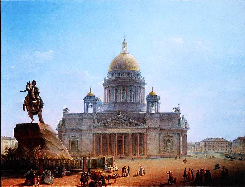 Картина «Исаакиевский собор и памятник Петру I» написана вскоре после окончания многолетнего строительства храма по проекту О. Монферана и возведения конного монумента императору работы скульптора Э. Фальконе. Вид, запечатленный художником, любопытен. Зная, что точка, с которой была написана работа, располагается на набережной, становится удивительным ракурс сверху, с которого Воробьев якобы смотрит на проходящих по площади людей и проезжающие экипажи.