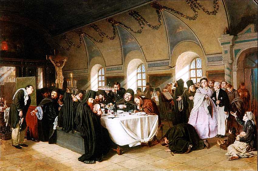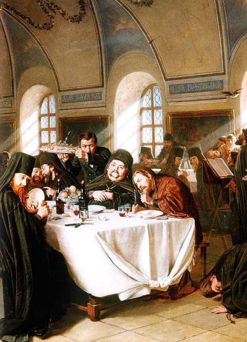Полотно «Трапеза» представляет зрителю сцену монастырского обеда с роскошно накрытом столом, изобилующим разнообразными яствами. Разворачивающаяся на глазах композиция словно иллюстрирует мерзость поведения и уродство сущности представленного духовенства. В общем шуме вакханалии, происходящей на фоне распятого Христа, разрумянившиеся батюшки предаются земным утехам пьянству и чревоугодию, в правой части картины один из сановников заискивает перед богатой барыней. Устроенный в храме балаган, изображенный Перовым, выдает истинное лицо церкви того времени. По выражению современника художника, Ф. М. Достоевского, «исчезли и стерлись границы добра и зла».
