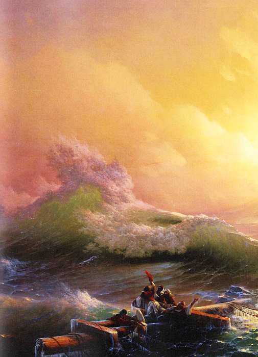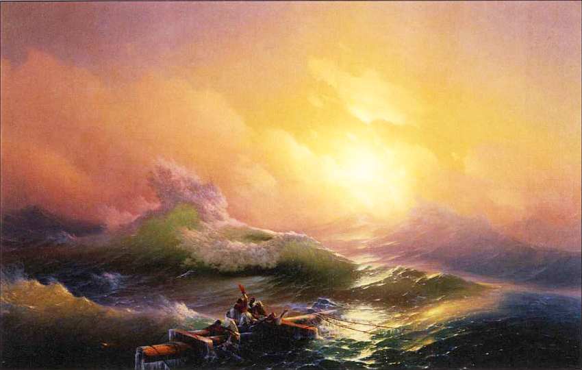 Изображенное после ночной бури море, едва переведя дух, должно встретиться с девятым валом. По легенде, именно он апогей штормов. За обломки мачт корабля цепляются выжившие изнемогающие мореплаватели. Озаренное рассветным солнцем небо словно сулит им победу. Натиск бури, противоборство грозной стихии, упоение борьбой, отчаяние и надежда на спасение все есть в этом полотне.