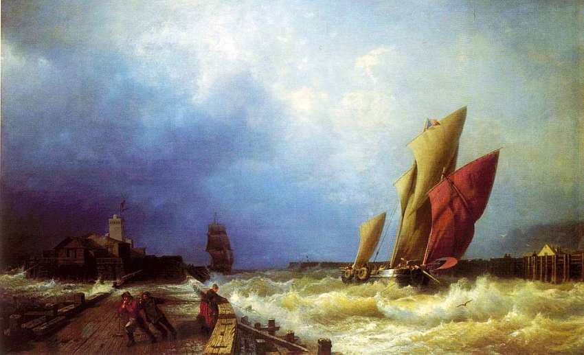 Картина «Вход рыбачьего судна в бурю в гавань Сен-Валери в Ко» разворачивает перед зрителем панораму средиземноморского побережья. Моряки пытаются пришвартовать к городскому причалу судно,