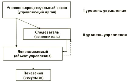 В этой системе нормы уголовно-процессуального закона выступают как высшее звено управления (I уровень управления), а следователь, призванный регулировать поведение допрашиваемого, оценивать соблюдение им процессуальных функций, как низшее звено управления (II уровень управления). Стрелки между подсистемами отражают управляющее воздействие на управляемый объект, а пунктирная линияобратную информационную связь. Внизу рисунка представлен результат работы системы показания, которые исходят от допрашиваемого.