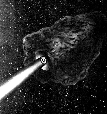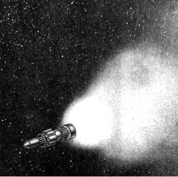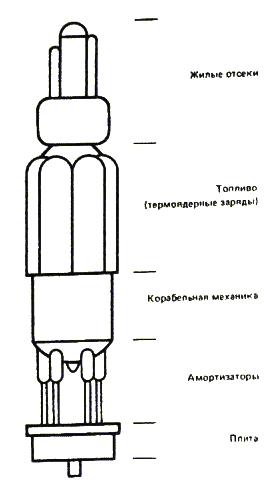 Свою идею звездолета «Орион» с импульсным термоядерным двигателем американский ученый Ф. Дайсон опубликовал в 1968 г. Как раз тогда растущие мировые арсеналы водородных бомб и невообразимая их мощь создали атмосферу страха перед будущим. Но вот тут-то и появился проект, где движение обеспечивалось взрывами водородных бомб возле массивной плиты, соединенной амортизаторами с остальными частями корабля (рис. 5, 6). Возникающие при термоядерных реакциях частицы высокой энергии, застревая в плите, передают ей свой импульс, а амортизаторы гасят резкие толчки от взрывов. Конечно же, то, что на топливо для «Ориона» шла начинка водородных бомб, вызывало всеобщую симпатию к проекту. «Какой это был бы замечательный день, если бы ужасное оружие удалось использовать вот таким мирным способом» писал американский журнал «Спейсфлайт» по этому поводу.