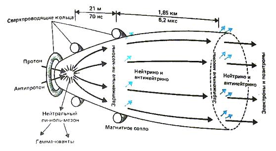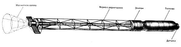Ученые Британского межпланетного общества полагают, что обе проблемы (создать неразрушаемый и ненагреваемый микровзрывами реактивный двигатель) было бы легче решить, если роль взрывной камеры и сопла двигателя передать магнитному полю и использовать реакцию аннигиляции. При аннигиляции протона и антипротона большая часть энергии уносится заряженными пи-мезонами, которые легко фокусируются магнитным полем специально подобранной конфигурации (рис. 7). Часть энергии микровзрыва приходится на нейтральные пи-ноль-мезоны, довольно быстро распадающиеся на гамма-кванты. Требование отнести полезные грузы достаточно далеко от реактора (чтобы уменьшить поток проникающего гамма-излучения) и снабдить ракету радиаторами для сброса поглощаемой энергии, по сути, предопределяют облик звездолета с аннигиляционным двигателем (рис. 8).