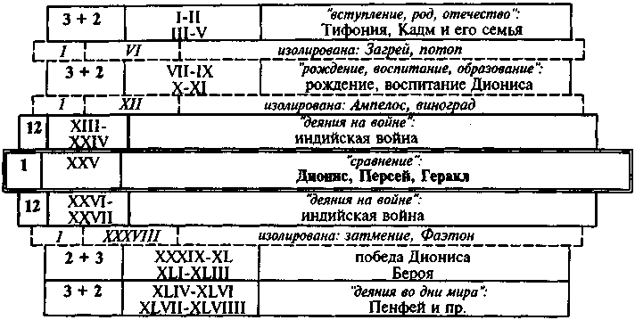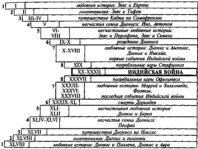 Обе приведенные выше схемы геометрической композиции представляются несколько искусственными; вряд ли они являются отражениями действительного замысла автора поэмы. Странно было бы предполагать, что в описании самой Индийской войны Нонн отказался от принципов композиции остальной части поэмы. Рудольф Кайделль считал, что Нонн оставил свою поэму незавершенной и издавал ее ктото другой, поэтому в ней нет никакого плана.